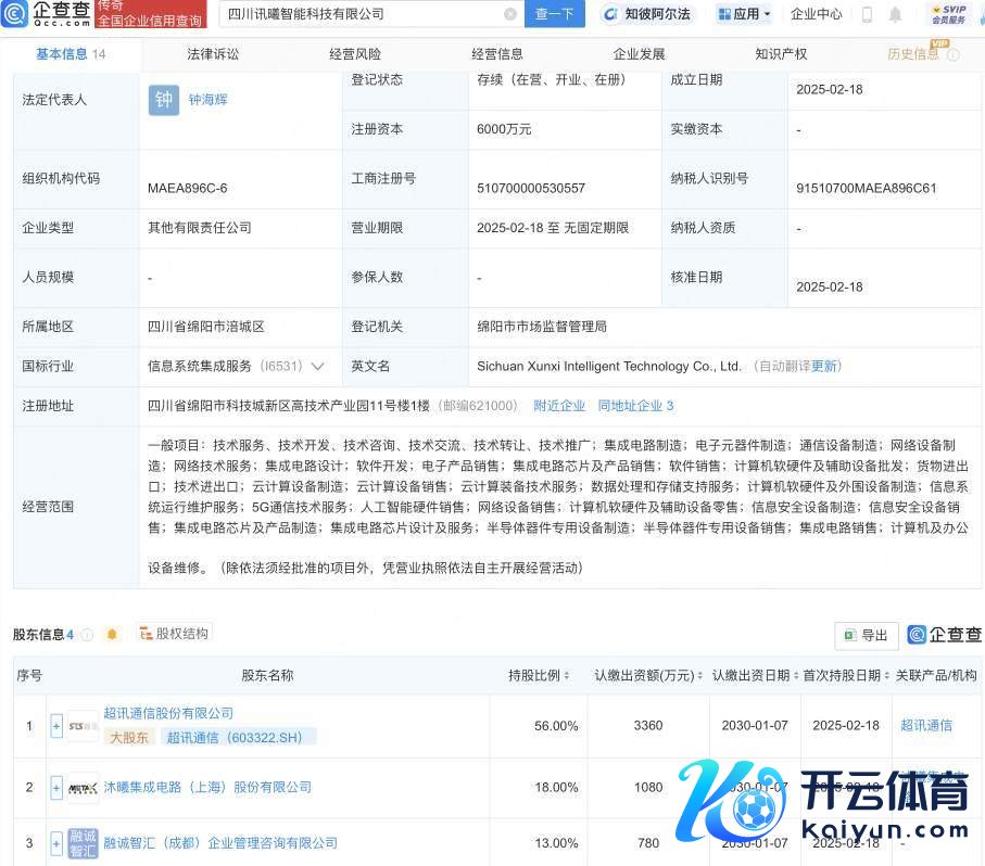 企查查APP泄漏,近日,四川讯曦智能科技有限公司建筑,法定代表东谈主为钟海辉,注册成本6000万元,筹算边界包含:5G通讯工夫功绩;东谈主工智能硬件销售;集成电路芯片遐想及功绩;半导体器件专用开拓制造等。企查查股权穿透泄漏kaiyun中国官方网站,该公司由超讯通讯(603322)等共同合手股。